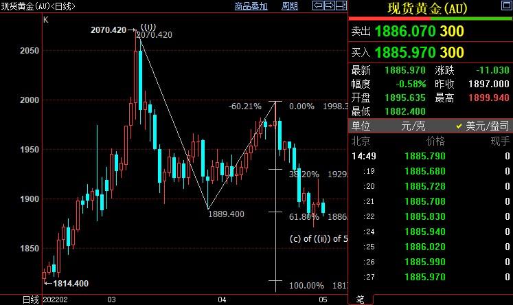 北京时间14:50,现货黄金下跌0.56%至1885.80美元/盎司;COMEX期金主力合约下跌1.33%至1886.30美元/盎司;美元指数上浮0.19%至103.39。