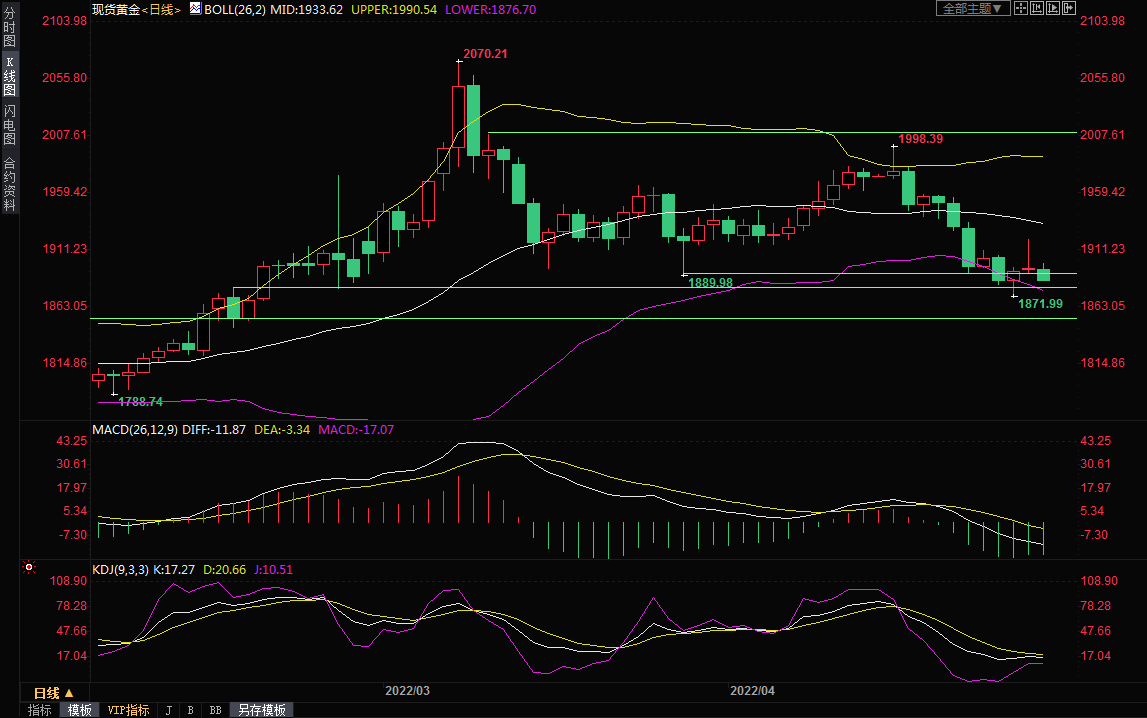 周一(5月2日)亚洲时段,现货黄金小幅走弱,目前交投于1887美元附近,上周五美元从高位回落一度给金价提供反弹机会,再加上美股大跌,金价一度反弹至1920美元附近,但市场目光仍然聚集本周的美联储决议,市场普遍预期加息50个基点,而且本周还将迎来非农等重磅经济数据,市场预期相对乐观,美元多头仓位增加,金价后市仍有进一步回调风险。