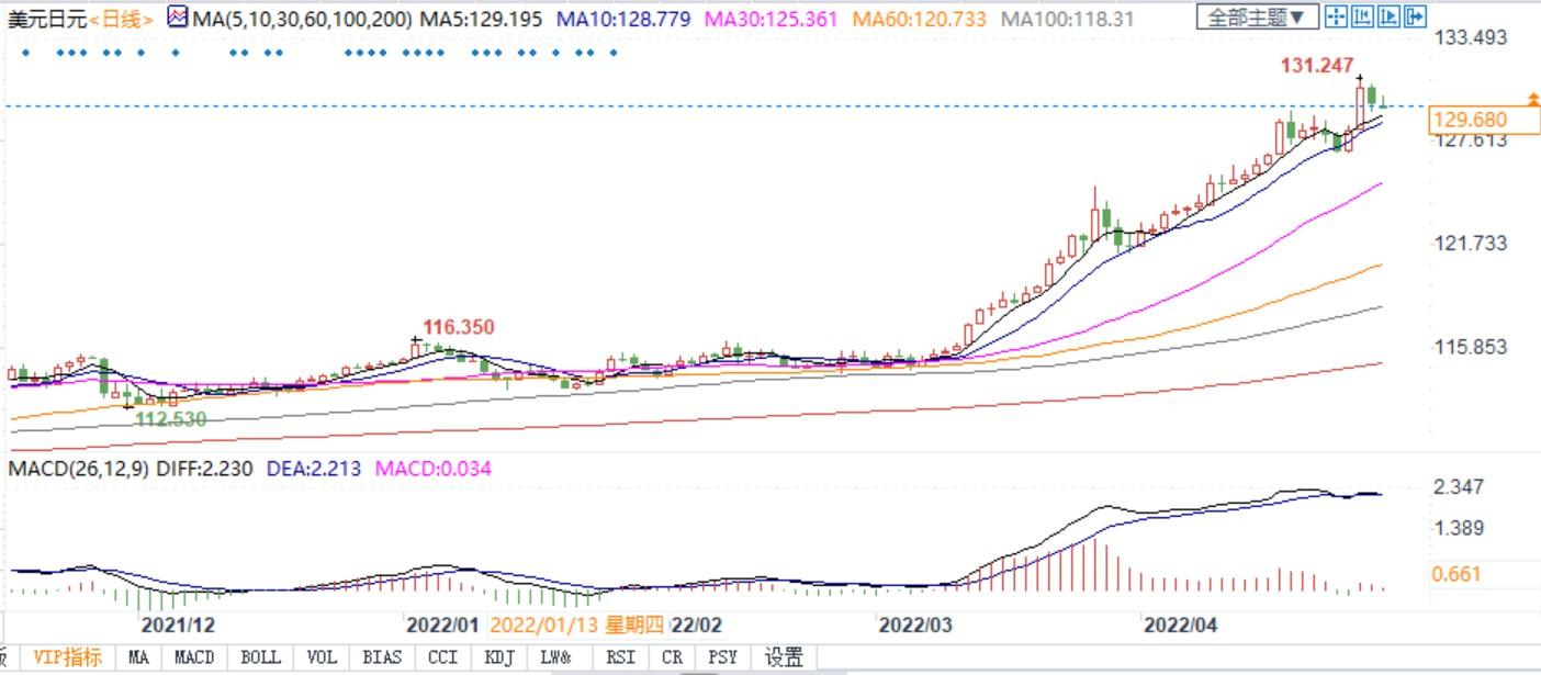 北京时间5月2日8:22,美元兑日元报129.69/72。