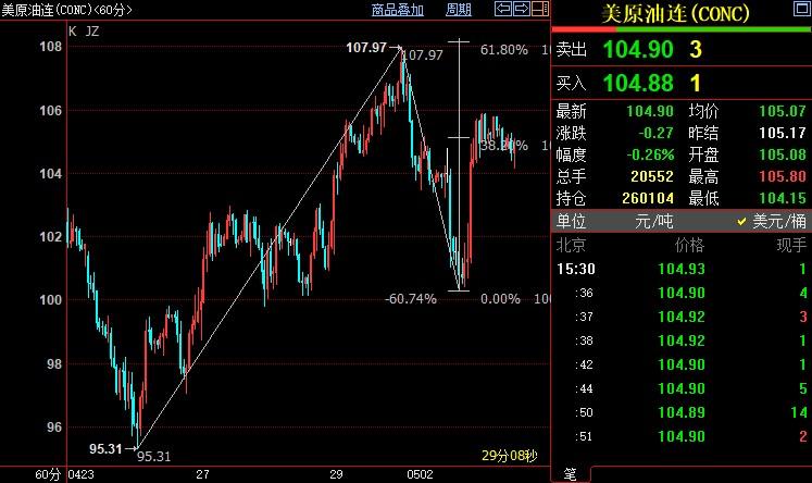 北京时间15:31,NYMEX原油期货下跌0.17%至104.99美元/桶;ICE布伦特原油期货下跌0.19%至107.36美元/桶。