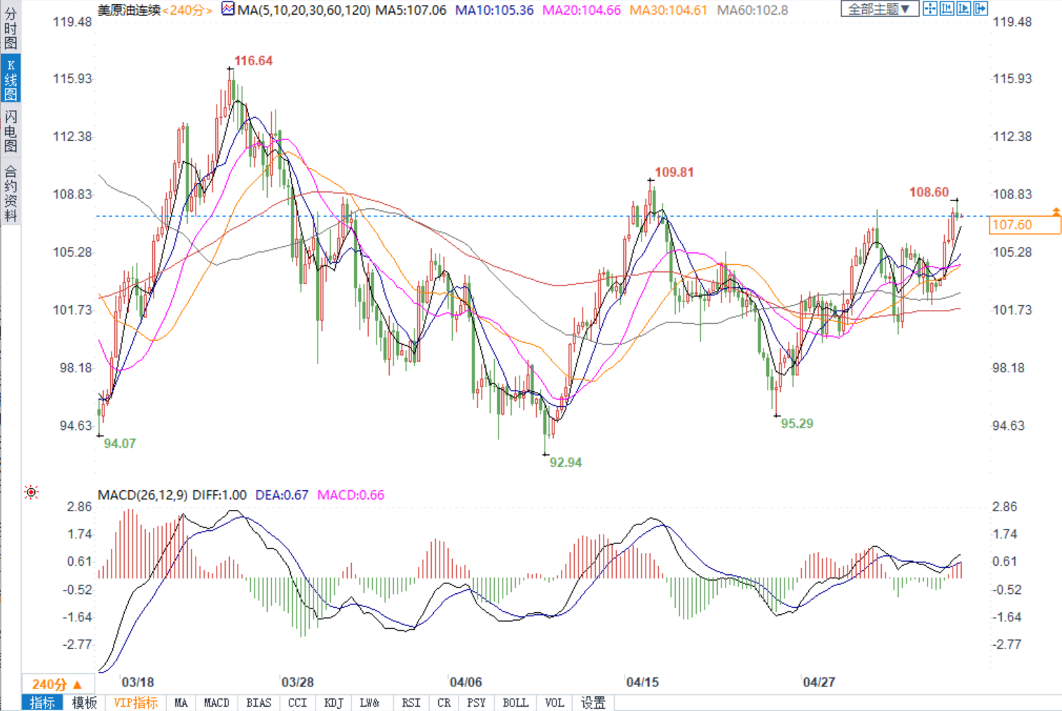 周三(5月4日)布油期货上涨5.17美元,涨幅为4.9%,结算价报110.14美元/桶。早前公布的EIA数据显示,由于俄罗斯供应减少的背景下美国炼油商增加对全球市场的供应,美国东海岸柴油库存降至纪录低点,加剧了供应压力。与此同时,欧盟委员会主席冯德莱恩称,欧盟提议在未来6个月内禁止进口俄罗斯原油,并在年底前禁止进口俄罗斯精炼油。