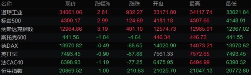 美股收盘情况:道琼斯指数收涨932.20点,涨幅2.81%,报34060.99点;标普500指数收涨123.92点,涨幅2.97%,报4299.40点;纳斯达克综合指数收涨401.10点,涨幅3.19%,报12964.86点。