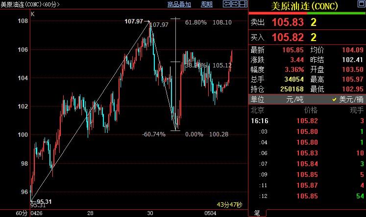 北京时间16:17,NYMEX原油期货上涨3.44%至105.92美元/桶;ICE布伦特原油期货上涨3.24%至108.37美元/桶。