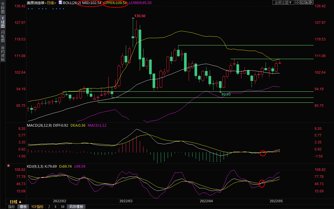 当然,由于油价在逾一个月的时间内均在110关口下方运行,未顶破布林线上轨前,油价仍可能维持震荡走势,即短线仍存在震荡回落的风险,下方5日均线支撑目前在105.63附近,布林线中轨支撑在102.53附近,若回落至该位置下方,则增加短线看空信号。