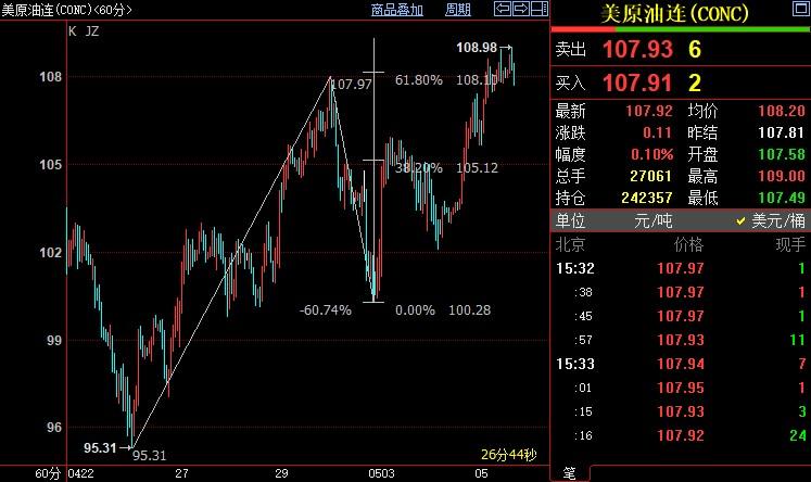 北京时间15:35,NYMEX原油期货上涨0.05%至107.86美元/桶;ICE布伦特原油期货上涨0.20%至110.83美元/桶。两大市场一度上涨逾1%,分别创4月18日以来新高至109.00美元/桶和4月19日以来新高至111.49美元/桶。