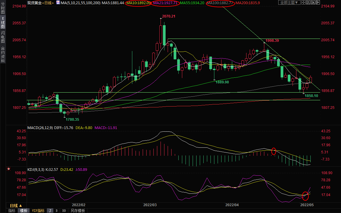 日线级别:震荡下跌后反弹;金价在1850附近获得支撑后反弹,KDJ低位金叉形成,K线在低位录得类似“启明星”的底部信号,短线偏向多头,初步阻力在4月29日高点1919.81附近,关键阻力在21日均线1927.70附近,若能收复该位置,则增加中线看涨信号。