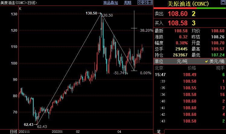 北京时间15:48,NYMEX原油期货上涨0.27%至108.55美元/桶;ICE布伦特原油期货上涨0.34%至111.28美元/桶。