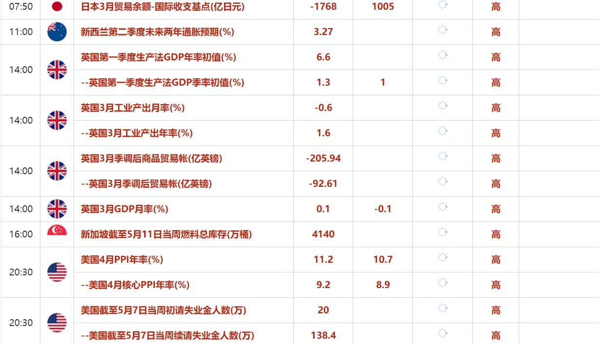 周四(5月12日)关键词:美国截至5月7日当周初请失业金人数,美国4月PPI,亚特兰大联储主席博斯蒂克