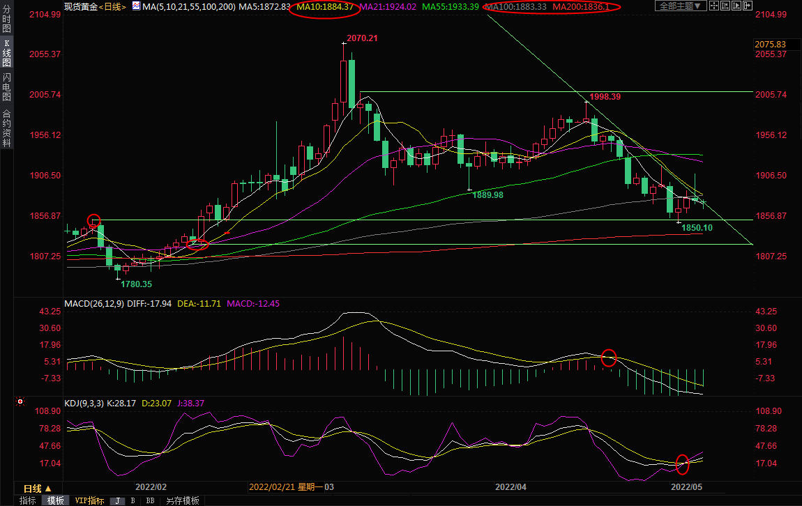鉴于周四的长上影线利空压制,如果金价失守1850关口支撑,则可能会进一步试探200日均线1836附近支撑。