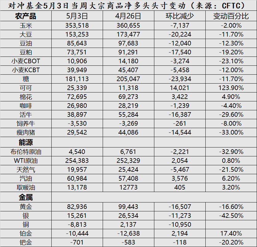 CFTC商品持仓解读:对冲基金对大宗商品多头押注降至去年12月以来最低(5月3日当周)