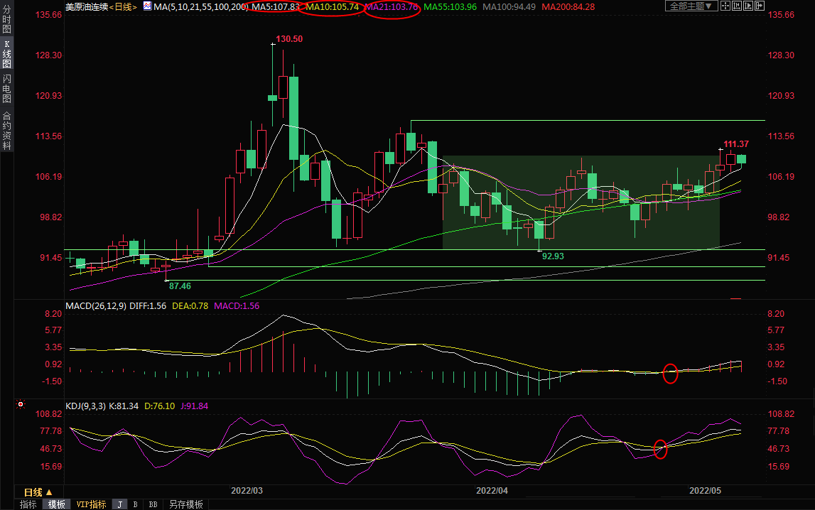 日线级别:震荡;MACD金叉,KDJ金叉,油价目前正试探布林线上轨和近一个半月震荡箱体的顶部阻力,均线多头排列,油价震荡向上突破的可能性较大,初步阻力在上周高点111.7附近,然后是3月25日高点114.12附近阻力,较强的阻力在3月25日高点116.64附近。