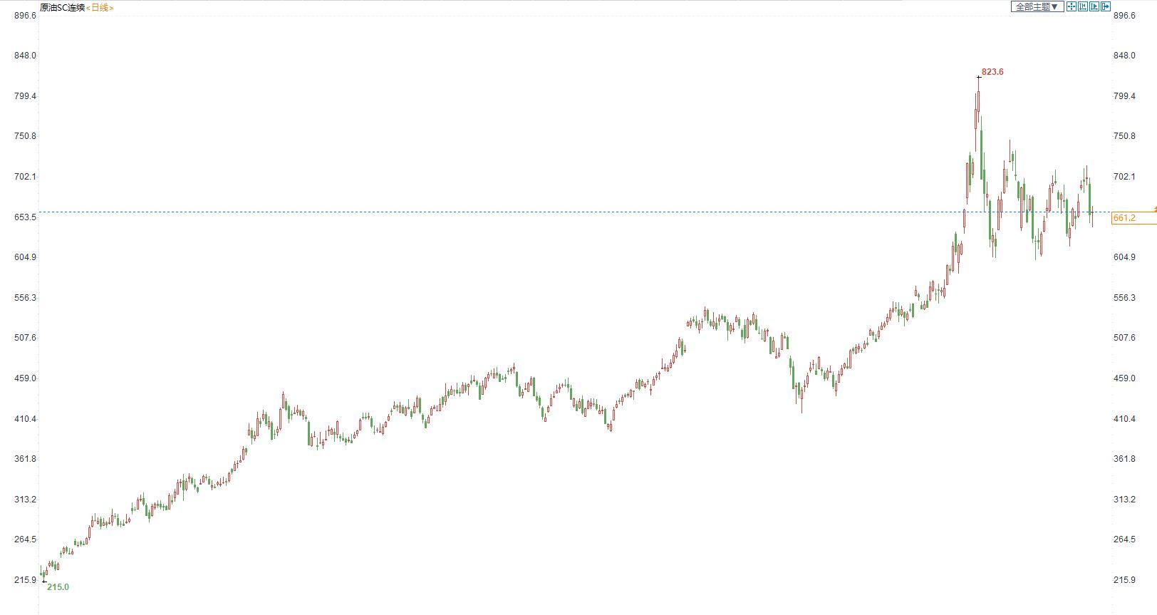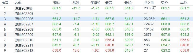周三(5月11日)上海原油价格收盘下跌11.7,跌幅1.74%。主力合约2206终盘收于661.2元/桶,跌11.7元/桶。油价收盘下跌,整体依然维持在震荡区间中,投资者继续担忧央行收紧政策、高通胀和全球经济成长放缓,拖累原油市场。