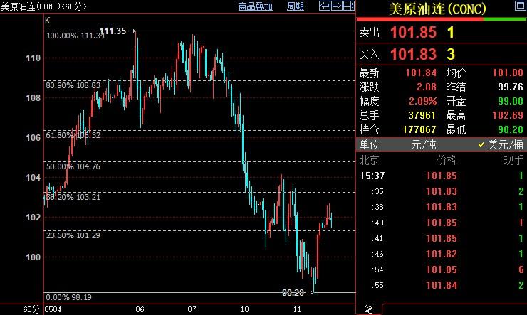 北京时间15:36,NYMEX原油期货上涨2.05%至101.81美元/桶;ICE布伦特原油期货上涨2.11%至104.62美元/桶。