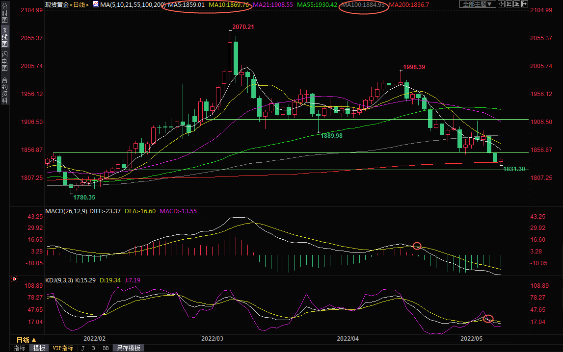 鉴于200日均线尚未完全失守,仍需要提防金价低位震荡调整或者震荡反弹的可能性,上方初步阻力在5月3日低点1850.10附近,5日均线阻力在1859附近,若意外收复该位置,则增加后市看涨新号。然后,进一步阻力在10日均线阻力在1869.88附近。