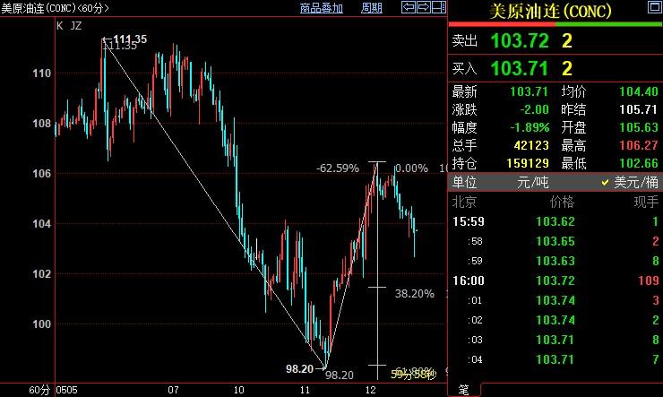 北京时间16:00,NYMEX原油期货下跌2.00%至103.60美元/桶;ICE布伦特原油期货下跌1.74%至105.64美元/桶。