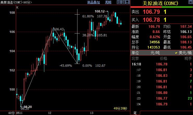北京时间16:11,NYMEX原油期货上涨0.41%至106.57美元/桶;ICE布伦特原油期货上涨0.53%至108.02美元/桶。