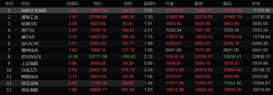 美股收盘情况,上周五,标普500指数上涨2.4%,报4023.89点;道琼斯工业平均指数上涨1.5%,报32196.66点;纳斯达克综合指数上涨3.8%,报11805点;纳斯达克100指数上涨3.7%,报12387.4点;罗素2000指数上涨3.1%,报1792.666点。