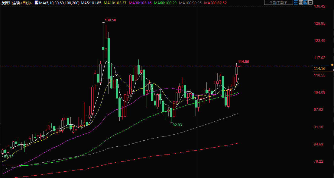 周二(5月17日)亚洲时段,美油徘徊于114美元/桶附近;美油周一上涨超3%,盘中一度触及3月10日以来新高至114.90美元/桶,因全球成品油供应紧张导致市场对夏季供应感到担忧。美国汽油期货有史以来首次突破每加仑4美元,全国平均汽油零售价格升至记录新高。