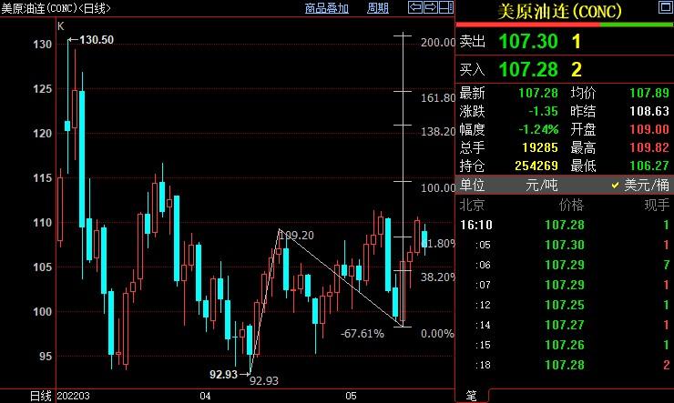 北京时间16:12,NYMEX原油期货下跌1.18%至109.19美元/桶;ICE布伦特原油期货下跌1.47%至109.91美元/桶。