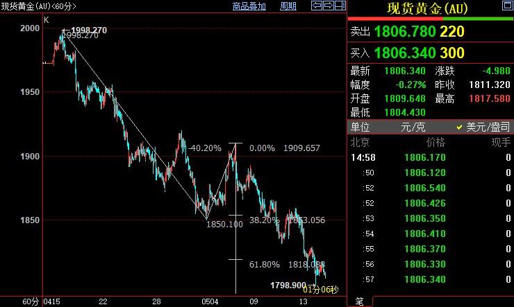周一(5月16日),国际金价在震荡交投中小幅下跌,重新逼近上个交易日创下的2月4日以来低点1798.98美元/盎司,因强势美元损害了以美元计价的黄金需求。金价下看1783美元。