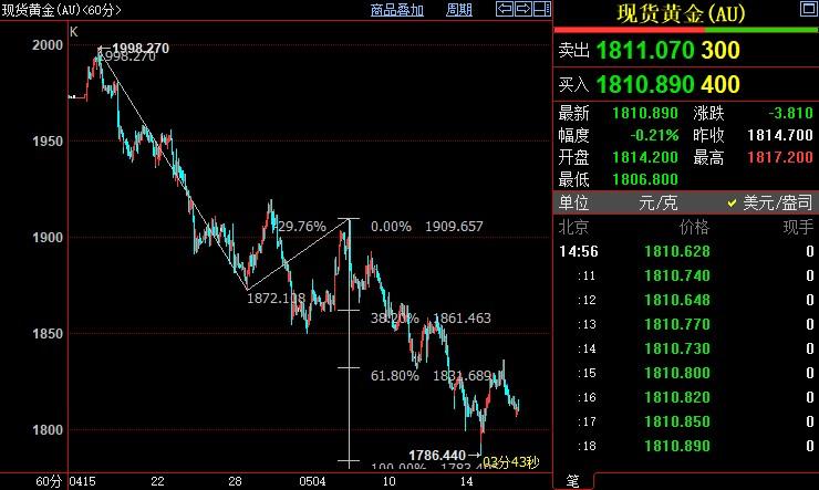 北京时间14:56,现货黄金下跌0.23%至1810.64美元/盎司;COMEX期金主力合约下跌0.57%至1808.5美元/盎司;美元指数上涨0.22%至103.51。