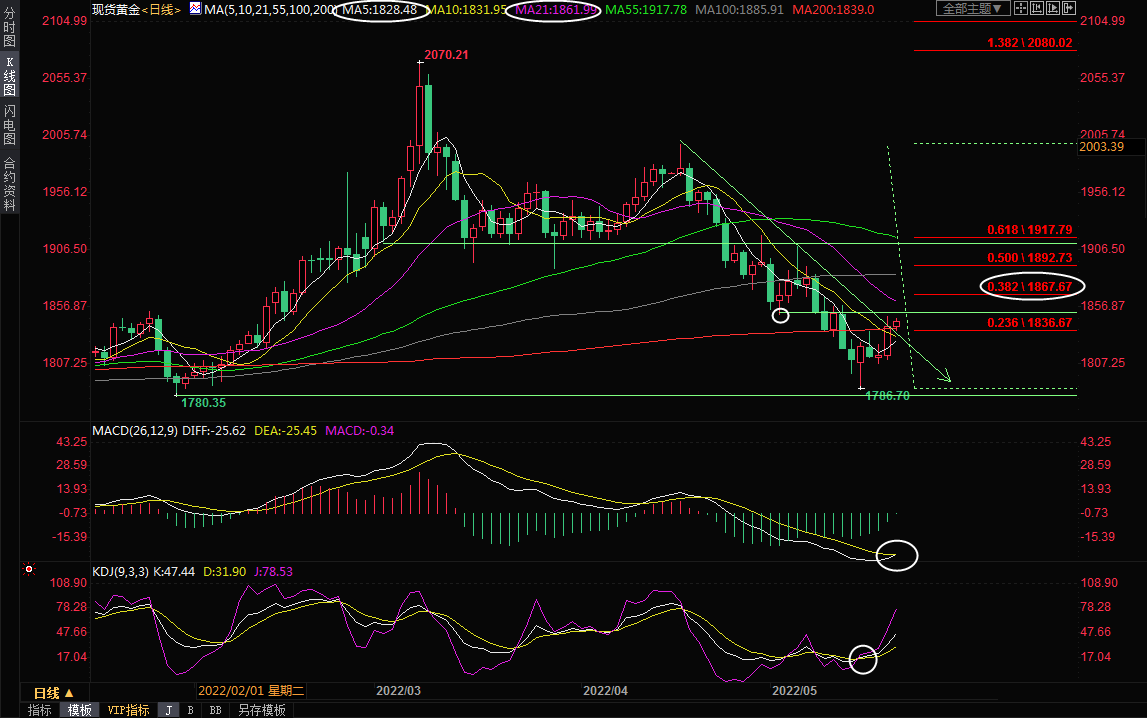 日线级别:单边下跌后反弹;KDJ金叉信号增强,MACD有金叉趋势,金价低位震荡后收复200日均线,在失守该位置前,短线偏向多头,甚至有望扭转前期跌势,初步阻力在5月3日低点1850关口附近 ,21日均线阻力在1862附近,1998-1786跌势的38.2%回撤位阻力在1867.67附近,若能收复该位置,则增加后市看涨信号。