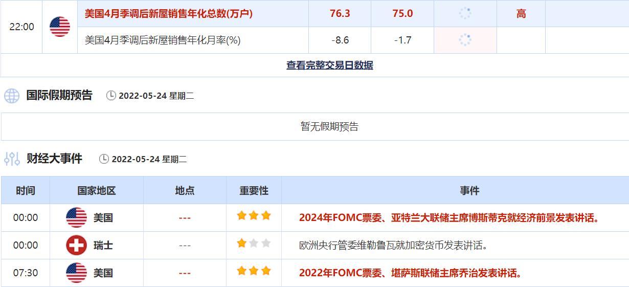 2022年5月24日,全球主要经济体将公布重要数据,需重点关注欧洲多国和美国的Markit制造业PMI,英国5月CBI零售销售差值,美国4月营建许可月率修正值,美国4月营建许可月率,以及美国4月季调后新屋销售年化总数(。大事方面需关注亚特兰大联储主席博斯蒂克就经济前景发表的讲话,以及堪萨斯联储主席乔治发表的讲话。