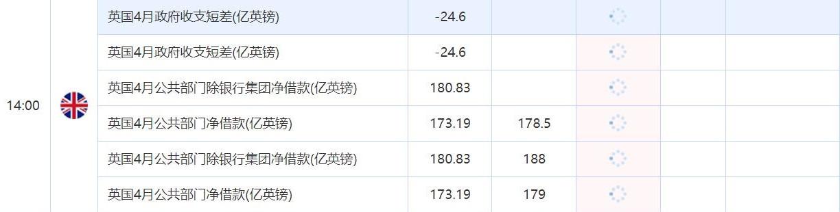 14:00 英国4月公共部门净借款(亿英镑) , 前值 173.19 , 预期值 179 , 公布值:待发布