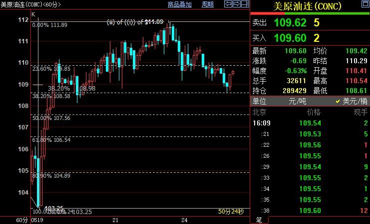 北京时间16:10,NYMEX原油期货下跌0.52%至109.72美元/桶;ICE布伦特原油期货下跌0.54%至112.81美元/桶。
