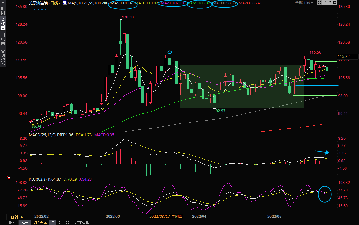 上方初步阻力在5日均线110.16附近,上周四高点阻力在112.62附近,若能收复该位置,则削弱短线看空信号。强阻力在5月17日高点115.56附近。