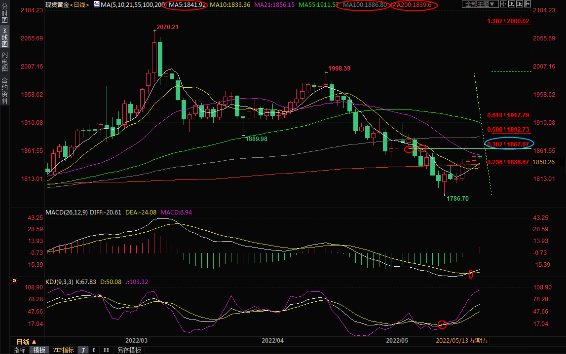 日线级别:单边下跌后反弹;MACD金叉,KDJ金叉,技术面多头依然占据上风,但之前在5月6日低点1866附近受阻,5月10日高点和1998-1786跌势的38.2%回撤位、布林线中轨阻力都在该位置附近,部分多头有所退却,短暂走势变数较大。