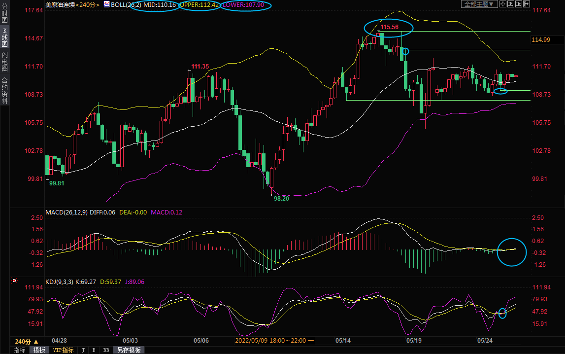 4小时级别:震荡;布林线收口后水平运行,KDJ金叉运行,MACD粘合,布林线中轨目前给油价提供支撑,短线有望试探布林线上轨112.42附近阻力,如果顶破该阻力,则增加短线看涨信号;进一步阻力在113.55附近,然后是近期高点115.56附近阻力。如果进一步上破,则有望看下120关口附近。