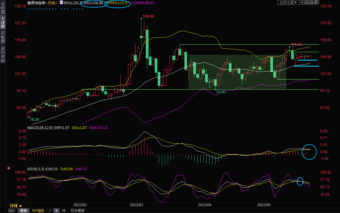 若油价坚守布林线中轨支撑,并顶破了112.62附近阻力,则增加短线看涨信号,布林线上轨和5月17日高点阻力都在115.56附近,如果进一步上破,则增加中线看涨信号。