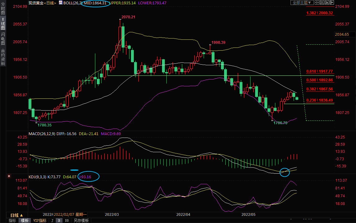 日线级别:震荡下跌后反弹受阻,布林线中轨附近的多重阻力对金价压制明显,KDJ有拐头的趋势,需要提防金价重回跌势的风险,初步支撑在200日均线1840.40附近,10日均线支撑在1837.32附近,5月20日低点支撑在1832.23附近,若跌破该支撑,则增加短线看空信号。