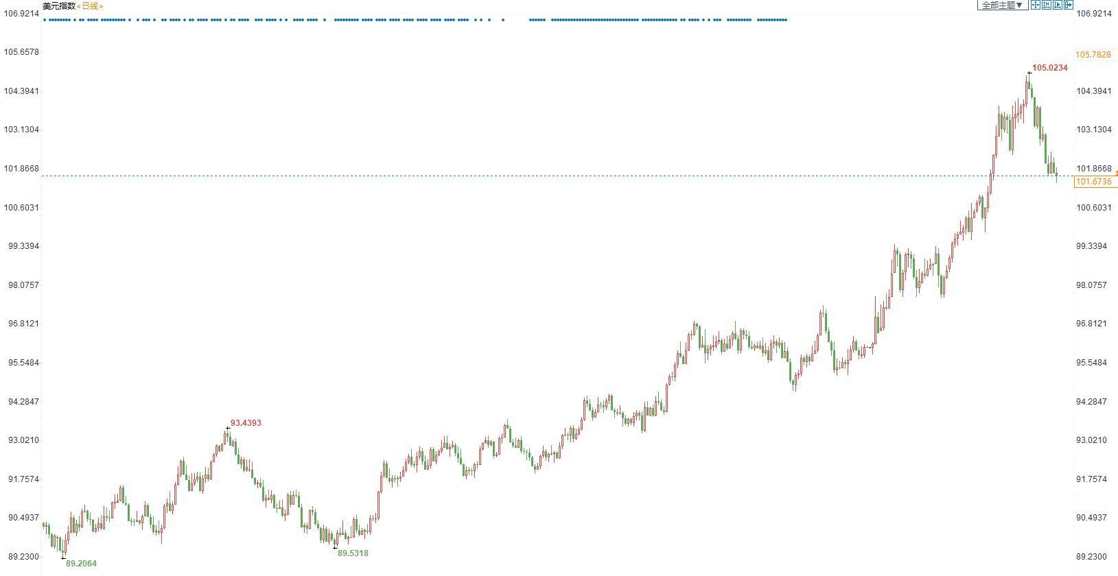 美元指数本周震荡回落,主要因美联储大幅度加息降温施压美元