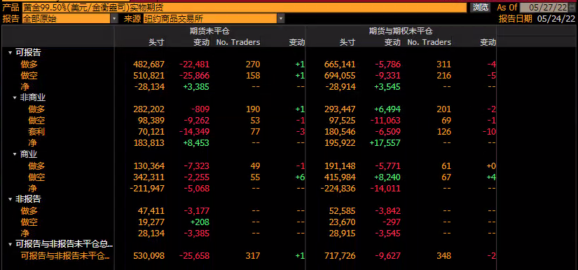 1.美国商品期货交易委员会(CFTC)数据显示,截止5月18日至5月24日当周,对冲基金的黄金净多头头寸增加了22924手合约,至77493手合约,净多头头寸是三周来的最高水平;只做多头寸增加10895手,至136718手,多头头寸是三周来最高;做空头寸减少12029手至59225手,空头仓位为近四周最低。