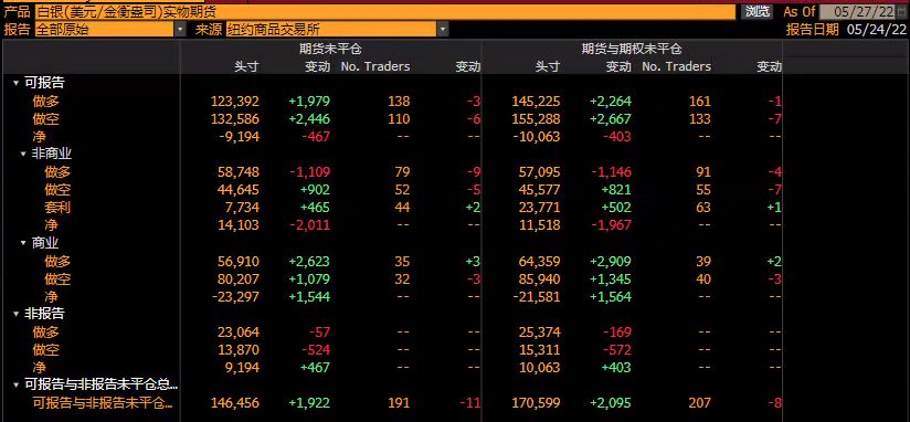 2.美国商品期货交易委员会(CFTC)数据显示,截止5月18日至5月24日当周,COMEX白银期货对冲基金转向看空,空头头寸比多头头寸多541手,一周前净多头头寸670手,净空头头寸是约三年来最悲观的时刻;