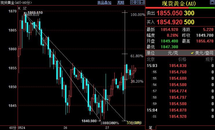 北京时间15:20,现货黄金上涨0.41%至1857.99美元/盎司;COMEX期金主力合约上涨0.44%至1855.7美元/盎司;美元指数下跌0.16%至101.063。