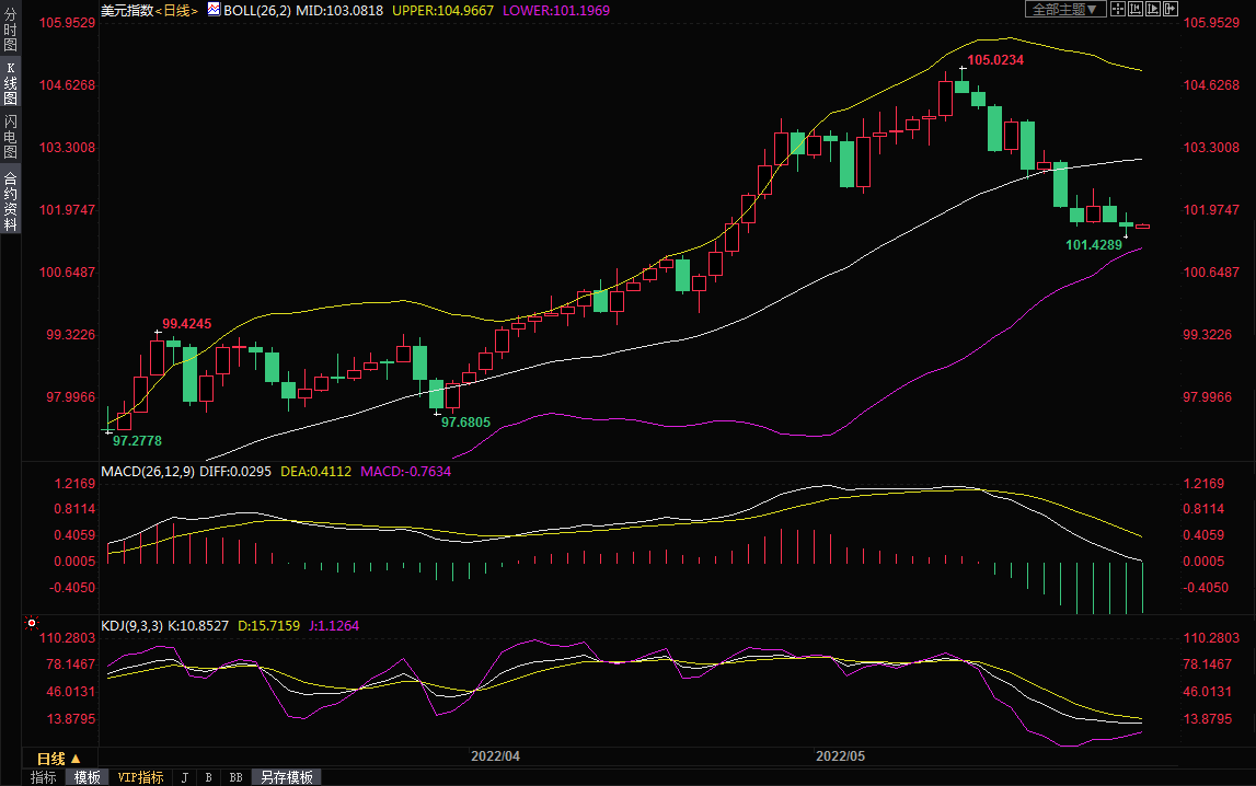 美元指数跌0.11%,报101.65,稍早曾触及101.43,为4月25日以来最低;上周,美元指数下跌1.33%,前一周跌幅为1.41%。