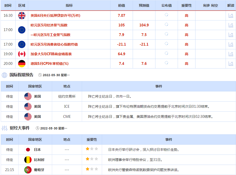 周一(5月30日)亚市盘初,现货黄金窄幅震荡于1850关口附近,虽然美元相对疲软,给金价提供支撑,但美国股市持续反弹,打压黄金的避险需求。标普500指数上周大涨近7%,预计周一亚欧股市会跟随涨势,金价的短线下行压力有所增加,原油市场,美国恰逢阵亡将士纪念日,出行增多,亚洲疫情也有所缓解,需求前景改善,再加上股市上涨,欧盟仍在推进禁止进口俄罗斯原油,油价周一小幅冲高,创逾一周新高至115.60美元/桶,本周偏向震荡上线,目前美原油交投于115.42美元/桶附近,后市有望震荡试探120关口附近阻力。