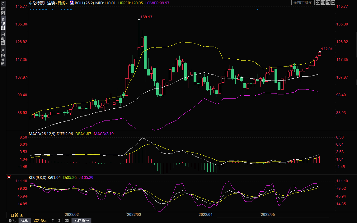 由于美国恰逢公共假期,交投淡静。将于周二到期的7月布伦特原油期货结算价上涨2.24美元,报每桶121.67美元,涨幅1.9%。截至北京时间周二5:00,美国原油期货上涨1.8%,报每桶117.17美元,延续了上周的强劲涨势。