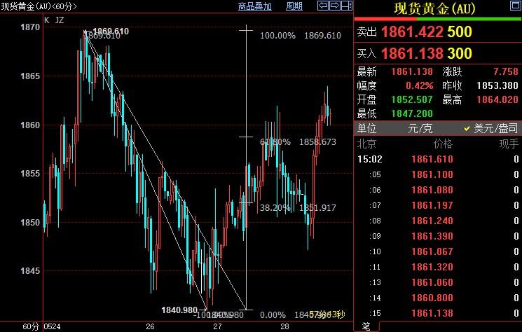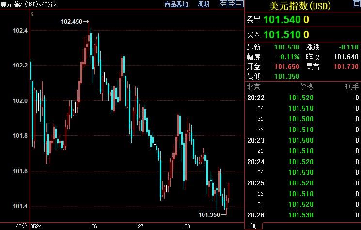 北京时间20:26,现货黄金上浮0.08%至1855.01美元/盎司;COMEX期金主力合约上浮0.07%至1858.6美元/盎司;美元指数下跌0.14%至101.527。
