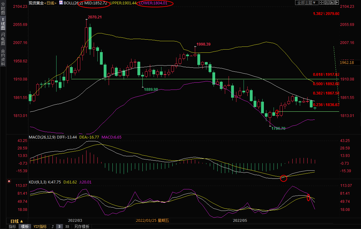日线级别:震荡;金价在前期跌势的38.2%回撤位强阻力附近受阻后震荡,布林线中轨对金价的压制也非常明显,目前回落至200日均线1841.40下方,KDI重新结成死叉,短线金价面临重回跌势的风险。初步支撑在5月18日高点1824.62附近,布林线下轨支撑目前在1803.93附近,能否进一步下破还有待观察。