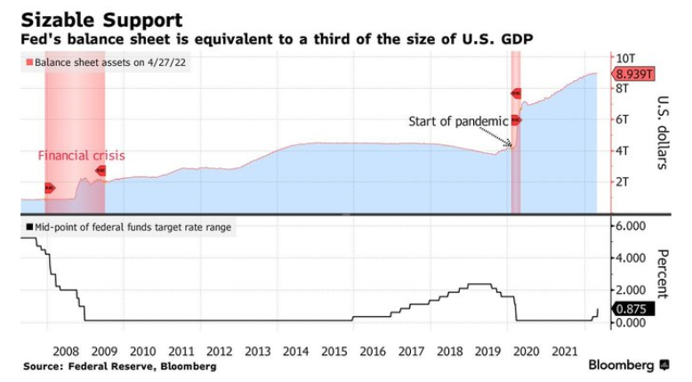 这将标志着其历史上新一轮量化紧缩(QT)时代的正式开启——美联储在5月会议上已宣布将从6月1日开始以每月至多475亿美元(其中300亿美元国债,175亿美元MBS)的步伐缩表,并将在三个月内逐步提高缩表上限至每月至多950亿美元(其中600亿美元国债,350亿美元MBS)。