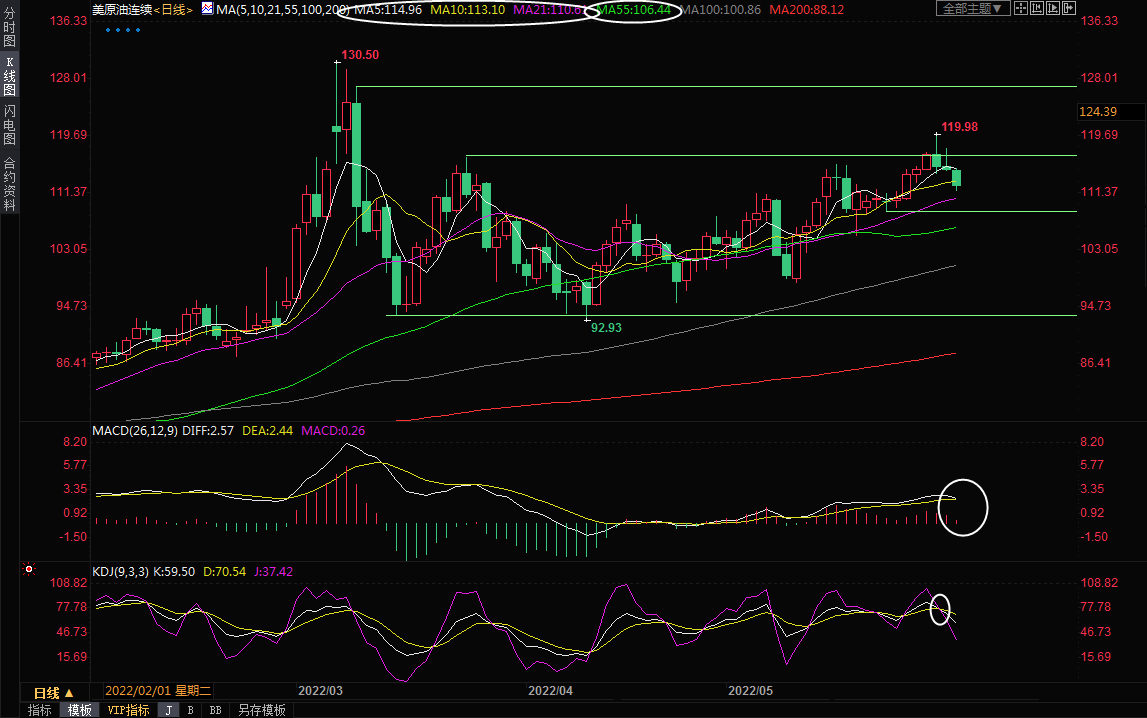 日线级别:震荡;MACD顶背离后死叉趋势,KDJ死叉运行,油价此前在120整数关口附近遇阻后回落,短线见顶风险显著增加,初步支撑在21日均线110.60附近,若失守该支撑,则增加短线看空信号;进一步支撑在5月24日低点108.61附近,55日均线支撑在106.44附近。