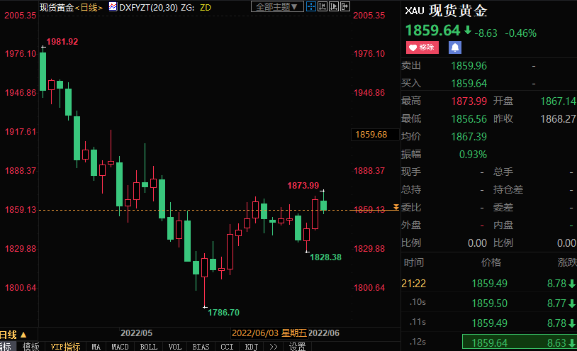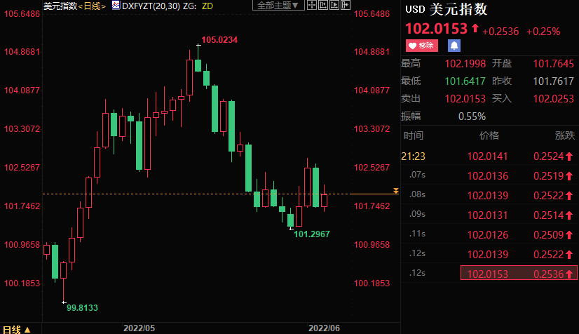 截至发稿,现货黄金上涨0.34%至1859.87美元/盎司;美元指数上涨0.33%至102.004。