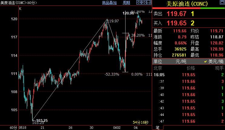 北京时间16:08,NYMEX原油期货上涨0.66%至119.65美元/桶;ICE布伦特原油期货上涨0.65%至120.50美元/桶。