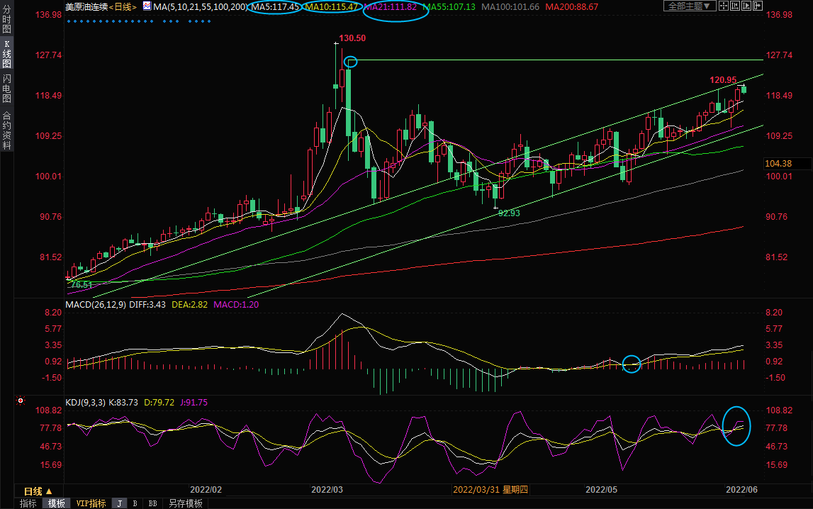 因为MACD金叉信号仍在,若油价能够守在117.77上方,则油价有望继续震荡走高。