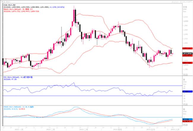 黄金上周整体属于震荡走势,涨跌互现,操作上难度加大。国际黄金周五大幅收跌,日内盘中最高上探1865一线后逐步走低,周六凌晨金价最低下探1847一线后震荡收盘于1851一线。日线录得阴线,短期金价冲高回落幅度扩大仍处于日线移动平均线技术指标支撑压力位价格区间,当前日线移动平均线呈粘合收窄形态,维持偏震荡趋势指引参考。小时线显示,短期金价高位回落,小时线移动平均线呈粘合向下交叉排列形态,维持震荡走势。从日线级别图上观察,现货黄金仍未能摆脱区间震荡的走势,波动区间仍集中在1820-1870之间。