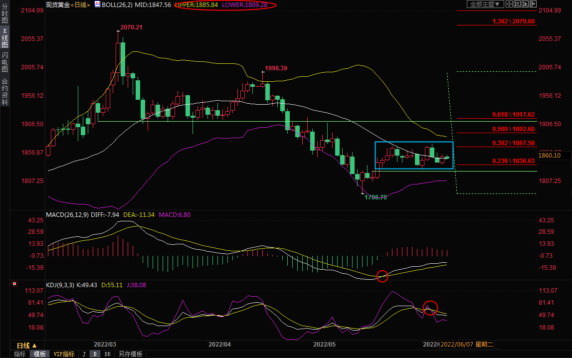 日线级别:震荡;金价目前在布林线中轨附近徘徊,MACD金叉,KDJ死叉,均线交织,短线走势缺乏明确方向,布林线轨道水平运行,可以参考布林线轨道1809.29-1885.86区域突破情况。
